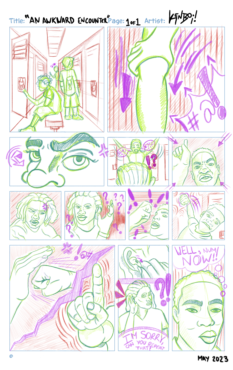 This storyboard idea was created after I witnessed an awkward encounter with two strangers at a gym. I thought this basic interaction could be dramatized in an anime style fashion to create a sense of drama in an almost relatable situation.