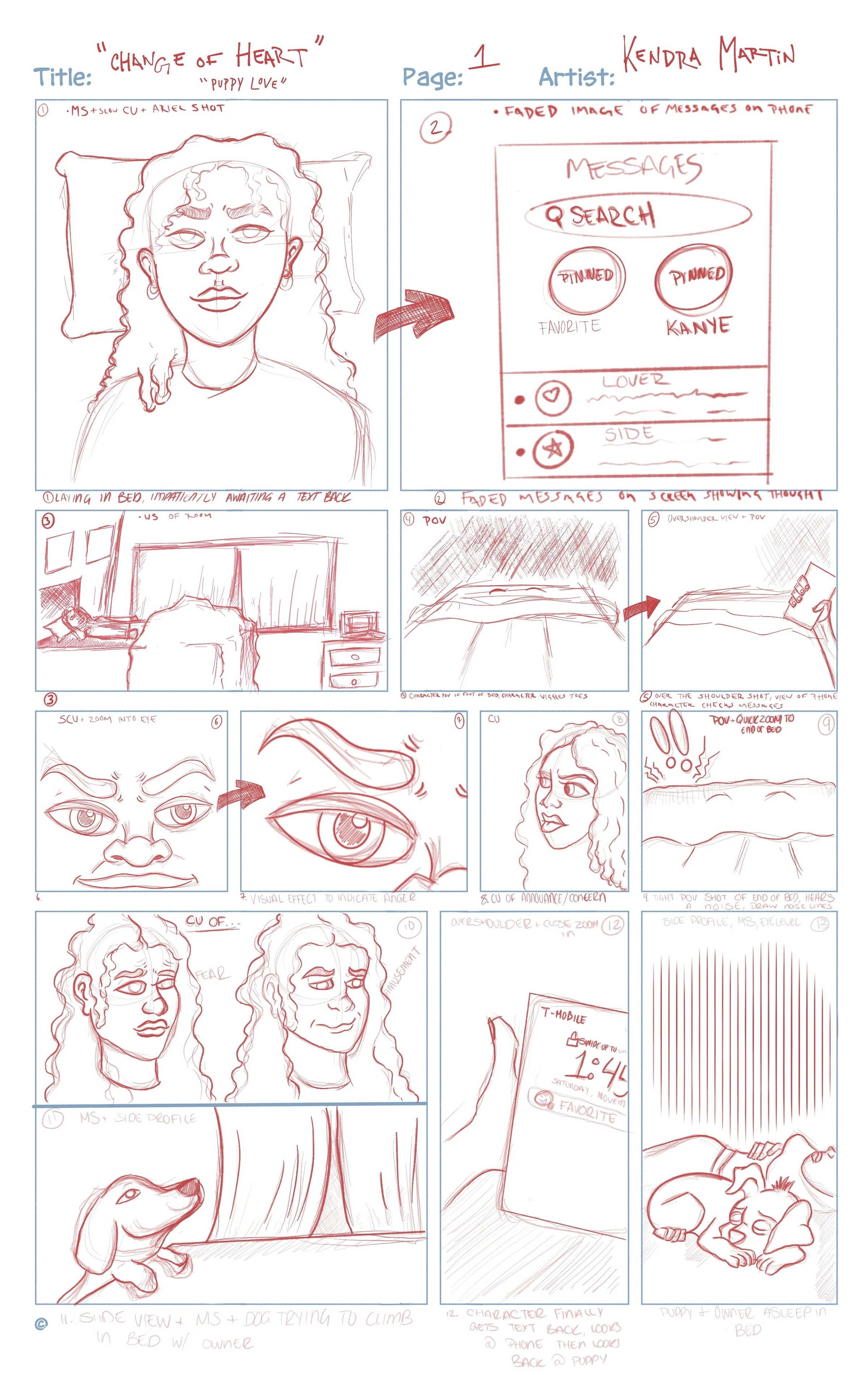 (Click Picture to access video) This storyboard was created for my (COM 212) class as an assignment to visualize a 1-2 minute Silent Film, suitable for inclusion in a Web Series titled "Change of Heart". The topic was completely up to us with the theme: "Change of Heart" We had to produce a Script along with a Storyboard individually. The class then selected and shot the two best and most "doable" scripts and storyboard ideas. I was one of the lucky ones chosen! I hope you enjoy my short silent film entitled "Puppy Love".